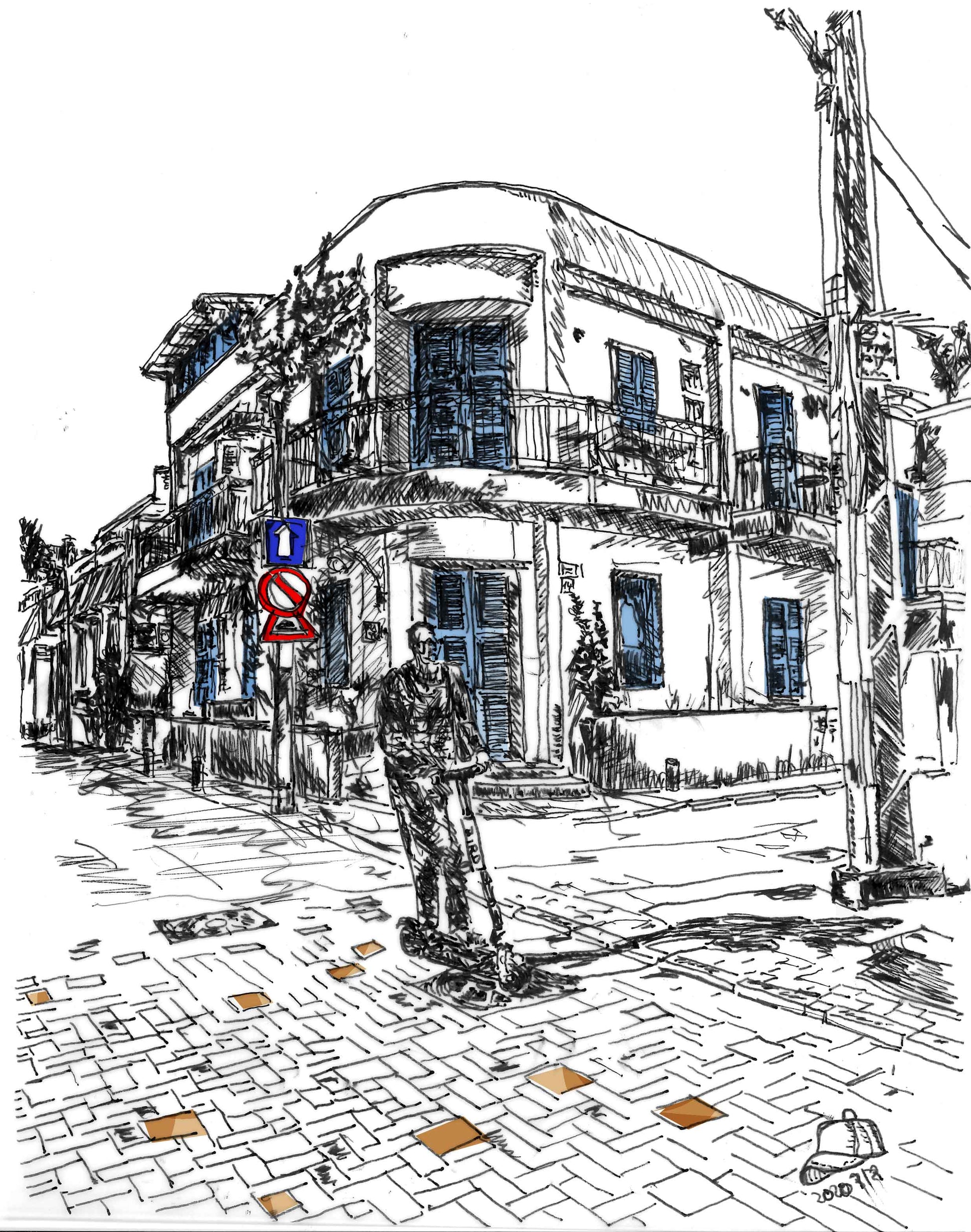 This is the famous Shabazi street of the wonderful area of Neve Tzedek, the first Jewish neighbourhood. Neve Tzedek is in the southwestern part of Tel Aviv, not far from the sea, and it is considered as a little village with galleries, shops, cafes and restaurant. Very appreciated by the tourists for the Bauhaus architecture, old buildings, and for the atmosphere. In this drawing you can see an electric scooter driver and a Bauhaus building on Shabazi street. itself. A life scene from everyday life.